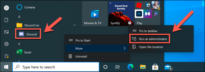 - To do this on Windows, you’ll need to run the Discord app as an administrator. You can do this by opening the Start menu and finding the Discord app listed. Right-click the entry, then select the **More **> **Run as Administrator **option.