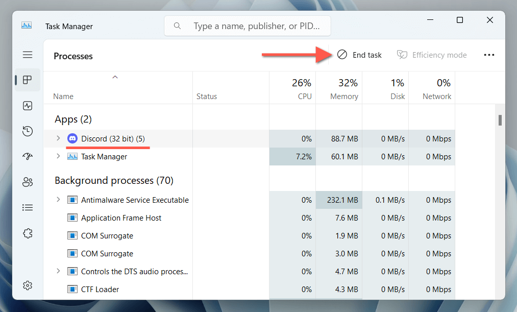 - Under the default Processes tab, locate and highlight Discord.