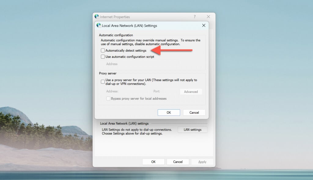 - Uncheck the box next to Automatically detect settings. Additionally, disable the Use automatic configuration script and Use a proxy server for your LAN boxes if active.