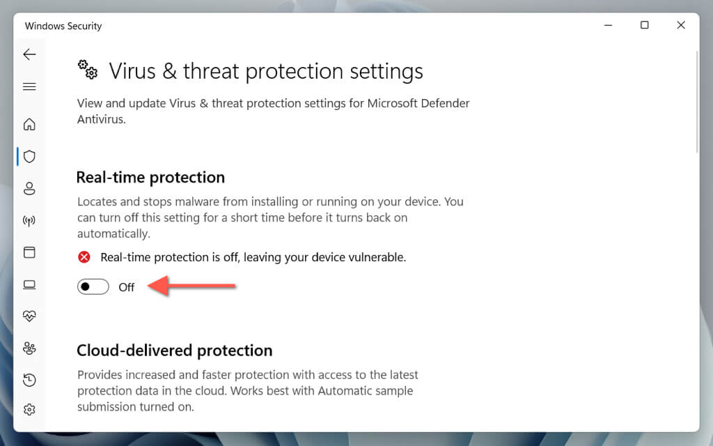 - Disable the switch under Real-time protection.