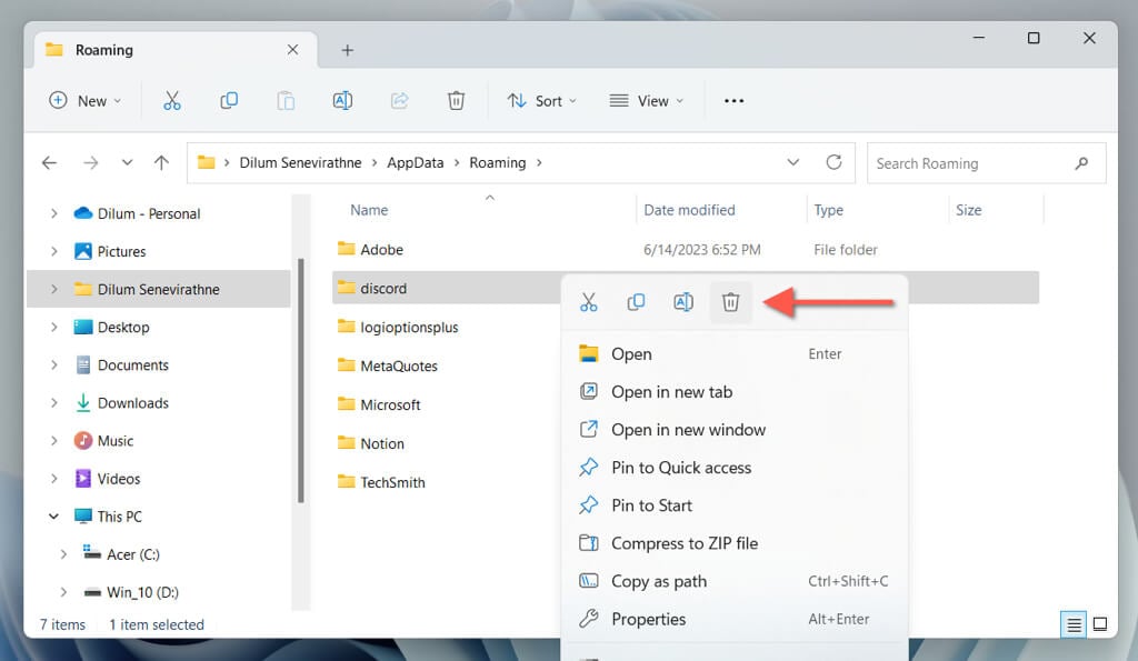 - On the File Explorer window that opens, right-click the sub-folder labeled discord, and select Delete. If you want to keep a copy of the cache, rename the discord folder to discord.old.