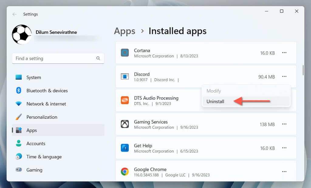 - Select Discord and choose Uninstall to remove all Discord app data from Windows.