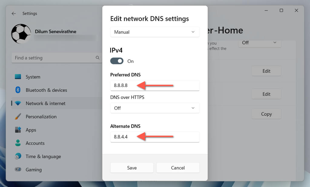 - Type 8.8.8.8 and 8.8.4.4 into the Preferred DNS and Alternate DNS fields, respectively, and select Save: