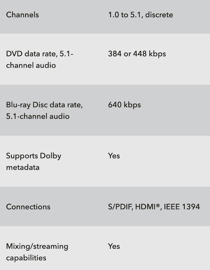 * **Dolby Digital**: 5.1 max channel sound at 640 kilobits per second * **Dolby Digital Plus**: 7.1 max channel sound at 1.7 megabits per second * **Dolby TrueHD**: 7.1 max channel sound at 18 megabits per second (“lossless”) * **Dolby Atmos**