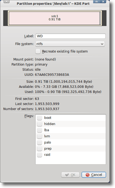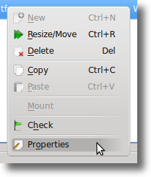 This will bring up a large Properties window, which offers the ability to change your partition’s label, file system, view partition information (such as mount point, UUID, size and sectors), and to change flags.
