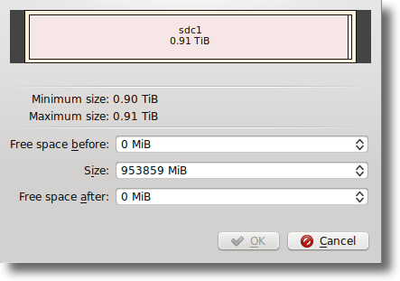 Now simply choose whether you want to have free space before or after your partition, and the new size the partition should be.