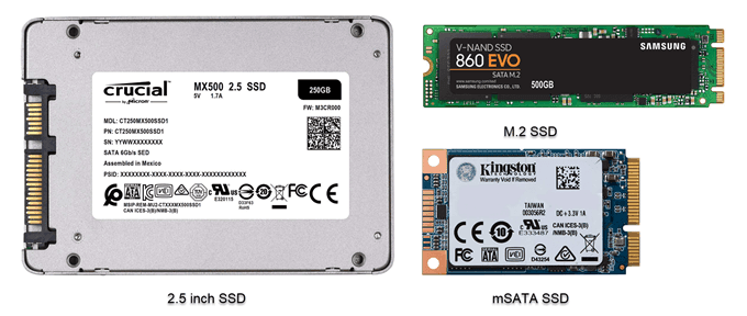 SSD drives come in three form factors for laptops; 2.5-inch chassis like an HDD, mSATA which looks like a card, and M2 which looks like RAM.
