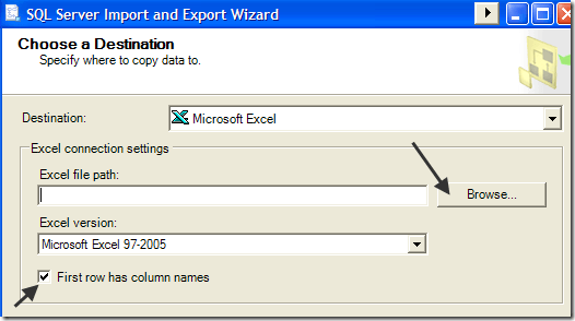 Now you need to choose the Destination. Go ahead and pick** Microsoft Excel** from the drop down list. After that, you will need to click Browse and choose the location for the output Excel file. Also, be sure to keep the “First row has column names” box checked.