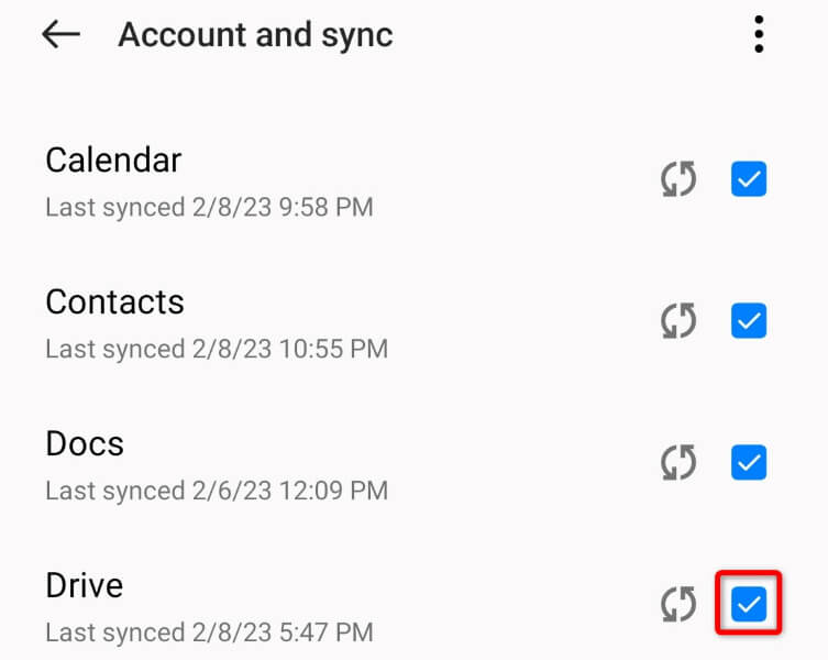 - Re-enable the option next to Drive. * Select the three dots in the top-right corner and choose Sync now to start the sync process.