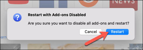 - Confirm you want to restart Firefox in Safe Mode by selecting the **Restart** option in the pop-up.