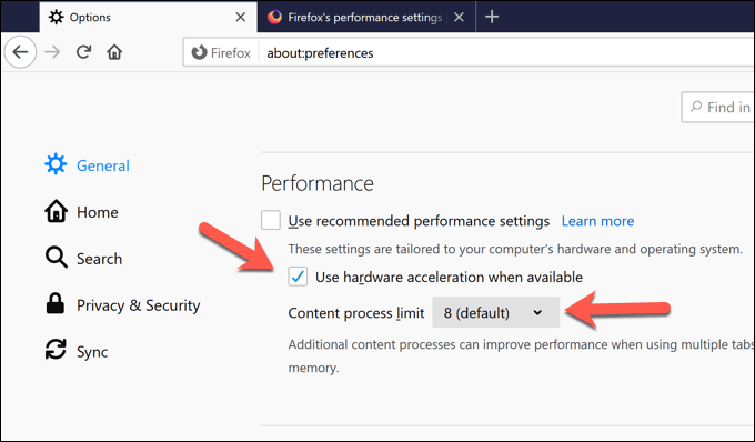 - Under the **General > Performance** section of the **Preferences** tab, uncheck the **Use recommended performance settings** option to view additional settings. From there, reduce the **Content process limit **value to limit the number of additional running Firefox processes and reduce memory usage in the process. Alternatively, disable hardware acceleration completely by unchecking the **Use hardware acceleration when available **option.