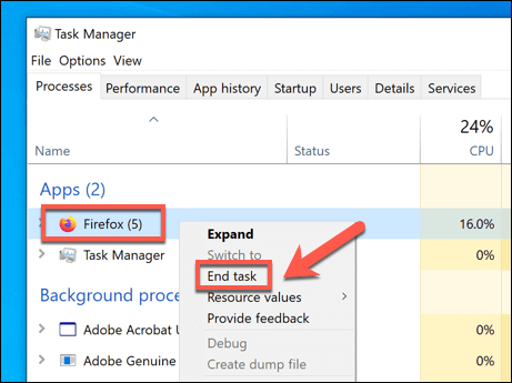 If that happens, and you think Firefox is the cause, an easy solution is simply to restart Firefox. Closing Firefox may not fully end any running Firefox processes, however. If you’re running Windows, you’ll need to check that all running Firefox processes have closed in Windows Task Manager.