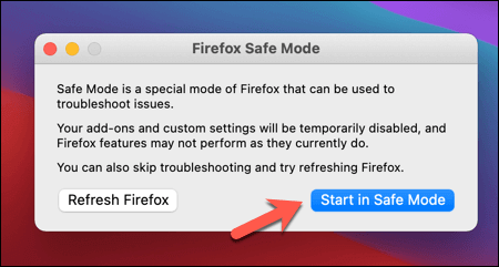 - Firefox will restart, giving you the option to open Safe Mode or reset Firefox entirely. Select **Start in Safe Mode** to launch Safe Mode.