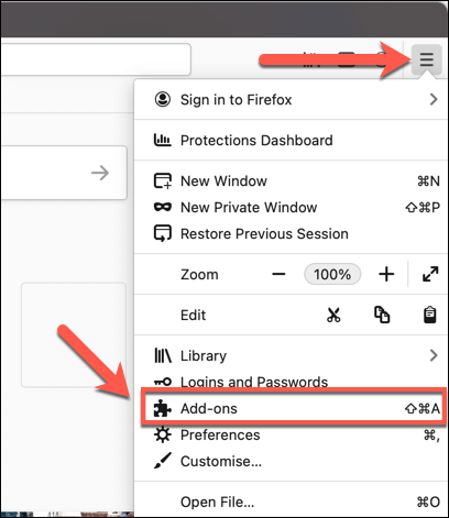 - To disable Firefox add-ons, open Firefox and select the hamburger menu icon in the top-right. From the menu, select the **Add-ons **option.