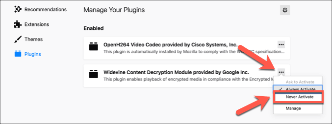 - If you’re worried that a Firefox plugin (such as a media playback plugin) is causing issues, select the **three-dots menu **icon next to a plugin in the **Add-ons > Plugins **menu. From the menu, select the **Never Activate **option to disable it.