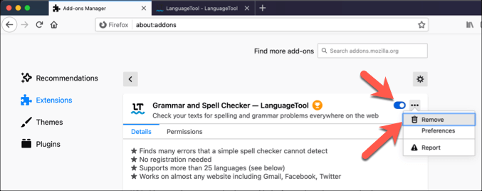 - In the **Add-ons **menu, you’ll see options for **Extensions**, **Themes**, and **Plugins** on the left. In **Extensions**, select the slider next to an enabled extension to disable it. To remove it, select the **three-dots menu icon **next to it, then select **Remove** from the menu.