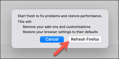 - Firefox will warn you that this will erase any browser settings, add-ons, and customization. It won’t, however, remove your bookmarks and browsing history. To confirm, select the **Refresh Firefox** option to begin the process.