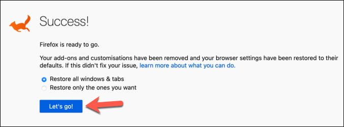- Once the reset process is complete, Firefox will restart. You’ll see a **Success **message, allowing you to restore previous tabs and windows. Confirm your choice, then select **Let’s go **to resume using Firefox.