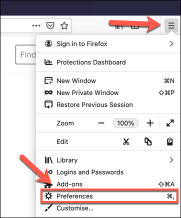 - To start, open the Firefox settings menu by selecting the hamburger menu icon > Preferences.