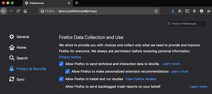 To do that, follow the path Options (Windows) or Preferences (Mac) > Privacy & Security > Firefox Data Collection and Use and edit the preferences for sharing telemetry data with Mozilla.