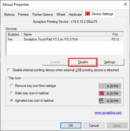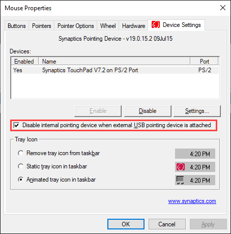 If the Mouse Properties dialog box doesn’t allow you to disable the touchpad while you have a mouse connected, the following registry hack should help unhide it. The following only applies to Synaptics touchpads.