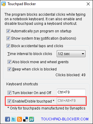Third-party utilities exist that can help you disable the touchpad in Windows 10. Touchpad Blocker is a perfect example. It’s a free program that lets you quickly deactivate the touchpad using a simple shortcut (set to **Ctrl **+ **Alt **+ F9 by default).