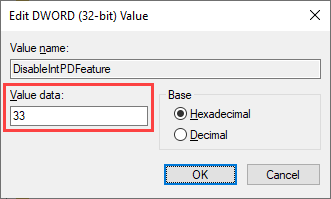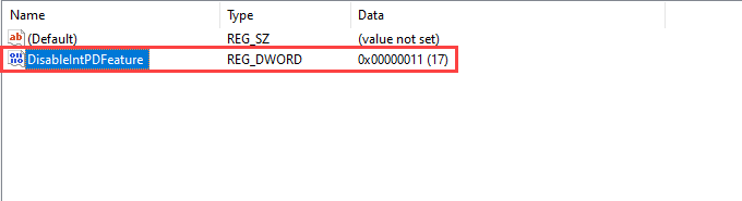 - Double-click the registry entry labeled DisableIntPDFeature.