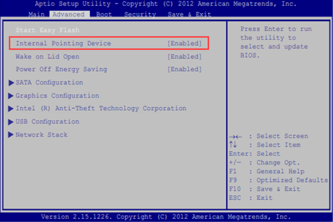 Look under each tab of the BIOS or UEFI for an option such as **Touchpad **or Internal Pointing Device.