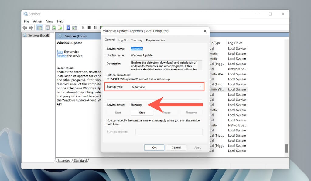 You must confirm that each system service related to Windows Update runs correctly.