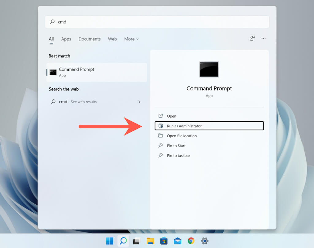 - Open the **Start **menu, type cmd, and select **Run as administrator **to open Command Prompt with administrative privileges.
