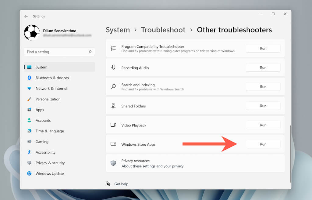 Under Other troubleshooters or Additional troubleshooters, select Run next to Windows Store Apps (Windows 11) or Windows Store Apps > Run the troubleshooter (Windows 10) to open it.