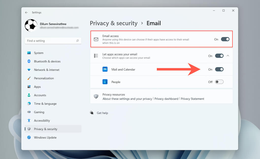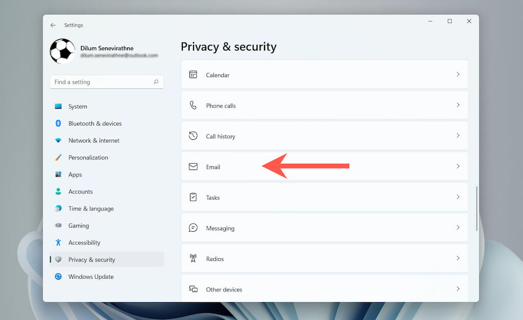 Select Privacy & security > Email (Windows 11) or **Privacy **> **Email **(Windows 10).