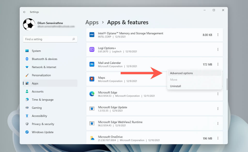 - Scroll down and select Advanced options next to Mail and Calendar.