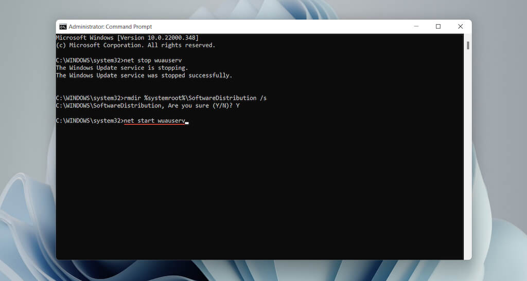 A corrupt Windows Update cache is another reason that results in “Error code 0x80070490.” Try deleting the folder that stores the cached files. The procedure involves running a series of commands using an elevated Command Prompt console.
