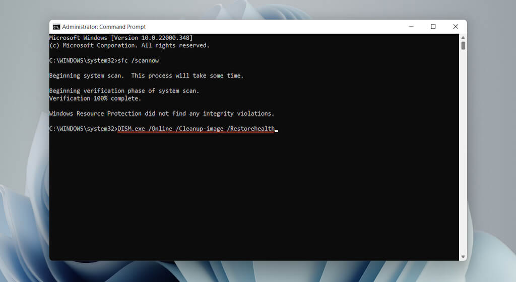 - Once the SFC scan finishes, run the following to invoke the DISM tool: