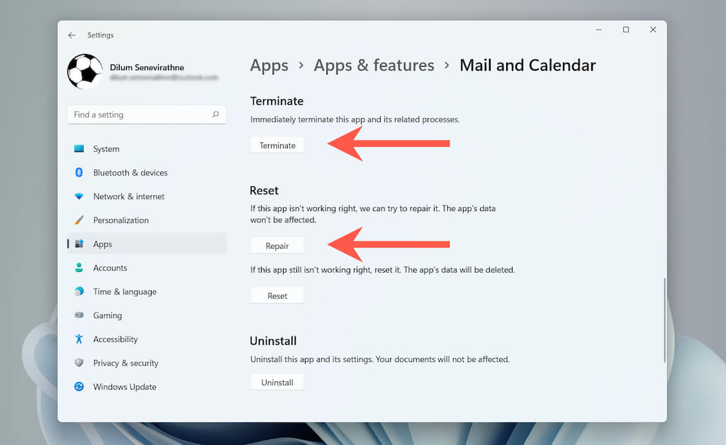 If repairing doesn’t help, you can choose to reset Mail and Calendar to factory defaults. To do that, select **Terminate **> **Reset **in the above screen.