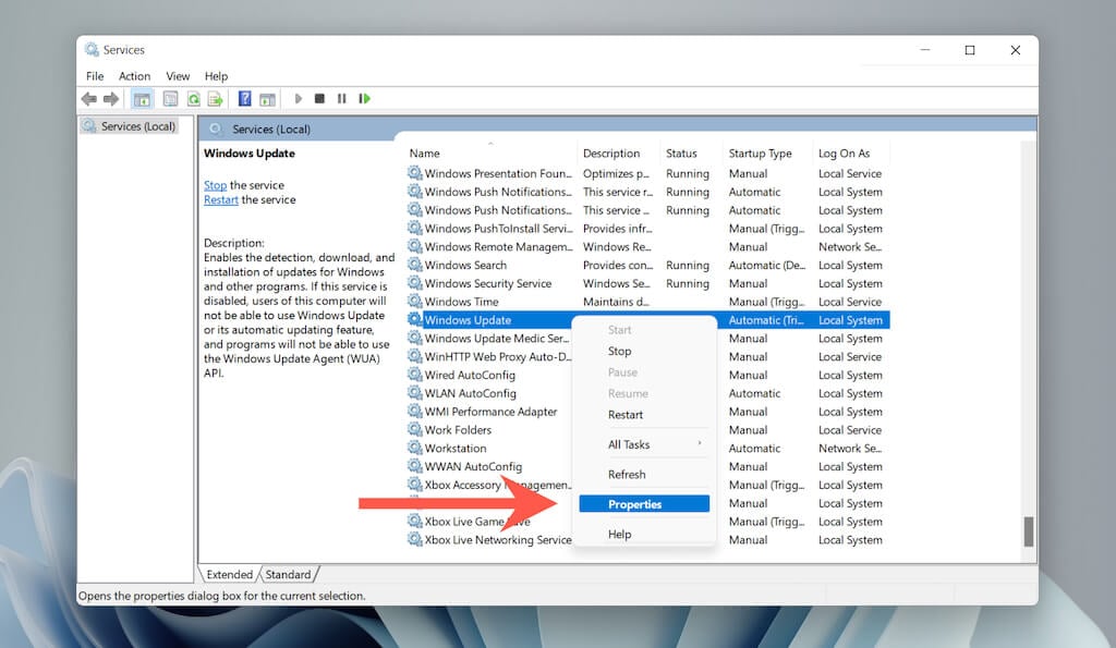 - Right-click Windows Update, Background Intelligent Transfer, and** Cryptographic Services** and select Properties.