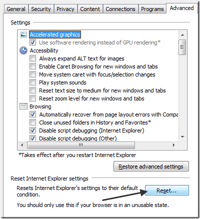 To reset Internet Explorer settings, go to Tools, Internet Options and then Advanced tab. Scroll down and under Reset Internet Explorer, click the Reset button. Then click it one more time. After it’s done, restart IE.