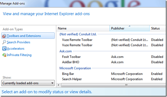 If the issue goes away, you know it’s an add-on. You can then go to IE 9, click on the Tool icon, and choose Manage Add-ons. Go ahead and disable the add-ons and then restart to see which one is causing the issue.