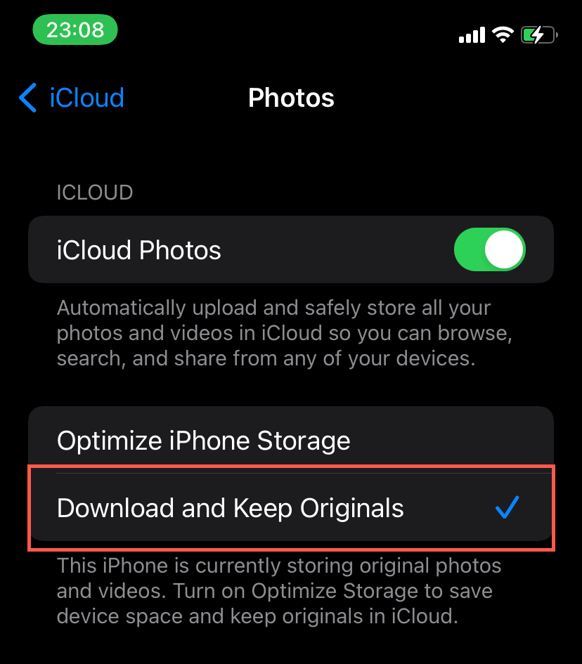 Your PC may also fail to show the photos inside the DCIM folder on your iPhone if the Optimize iPhone Storage setting for iCloud Photos is enabled. To disable it, open the Settings app, go to Apple ID > iCloud > iCloud Photos, and select Download and Keep Originals. That prompts your iPhone to redownload and keep the original versions of your photos instead of placeholders (which causes the DCIM folder to appear empty).