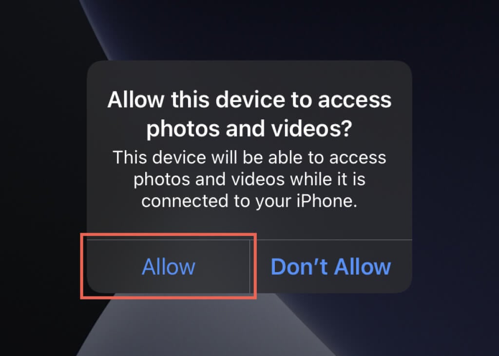 So, unlock your iPhone, wait for an “Allow this device to access photos and videos?” pop-up, and tap Allow. If you have iTunes installed, tap Trust on the “Trust This Computer?” pop-up instead.