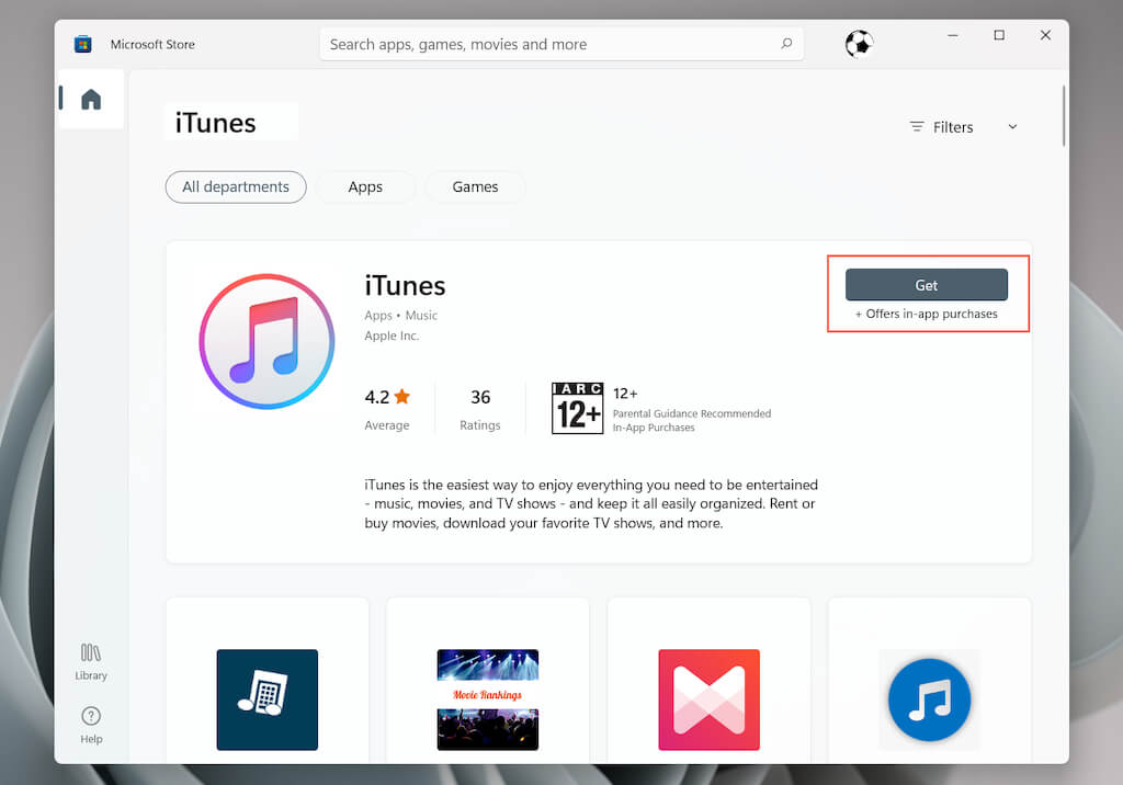 Open the Microsoft Store and select Library on the lower-left corner of the window. Then, select the Update button next to iTunes.