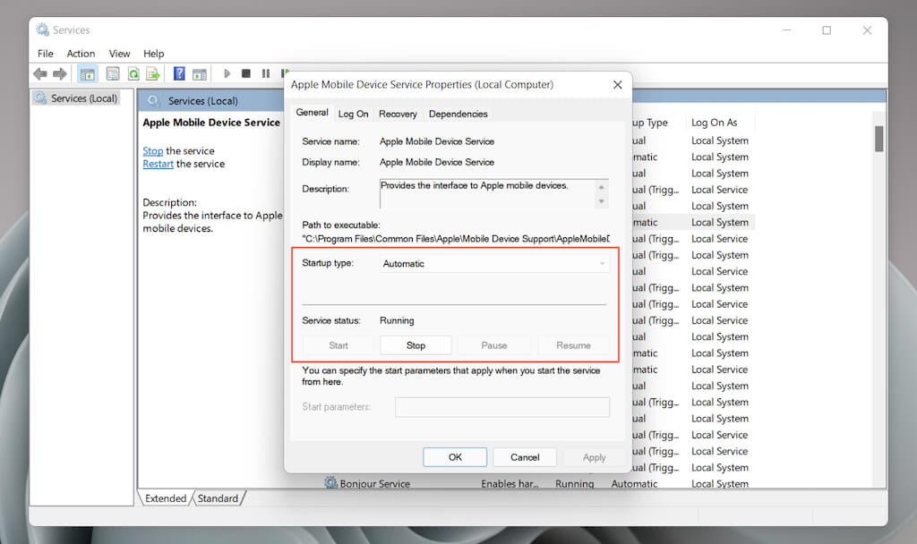 If you already have iTunes set up on your PC, use the Services app in Windows 11/10 to check that the Apple Mobile Device Service is active and runs automatically.