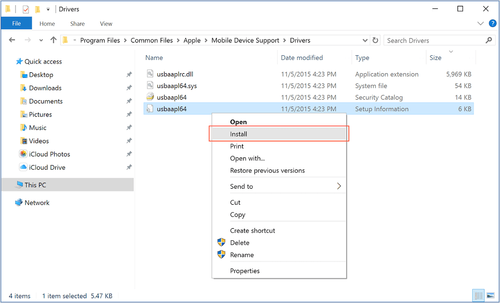 - Right-click the** usbaapl64.inf** or the** usbaapl.inf **file and select Install.