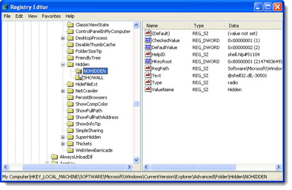 If your Hidden Files and Folders options are corrupt, the CheckedValue registry value of the following registry keys may have been modified. HKEY_LOCAL_MACHINE \ SOFTWARE \ Microsoft \ Windows \ CurrentVersion \ Explorer \ Advanced \ Folder \ Hidden \ NOHIDDENHKEY_LOCAL_MACHINE \ SOFTWARE \ Microsoft \ Windows \ CurrentVersion \ Explorer \ Advanced \ Folder \ Hidden \ SHOWALL