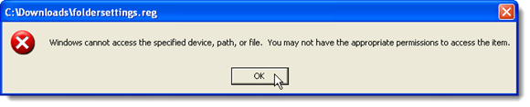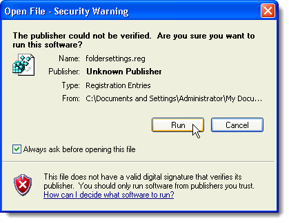 NOTE: When you try to merge the foldersettings.reg file, you may encounter a problem opening the file, and see the following Security Warning dialog box. We have scanned this file for viruses and then used it to fix this problem, and the file does not seem to be infected or corrupted in any way. Click Run to close it.