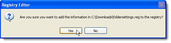 A confirmation dialog box displays to make sure you really want to add the information in the .reg file to the registry. Click Yes.