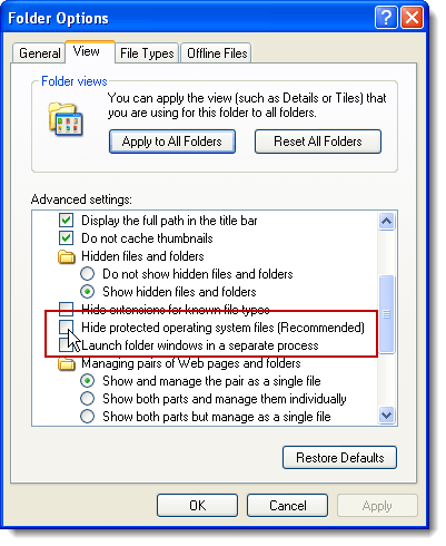 However, if needed, you can view these files by unchecking the **Hide protected operating system files (Recommended) **check box on the View tab of the Folder Options dialog box.