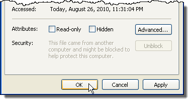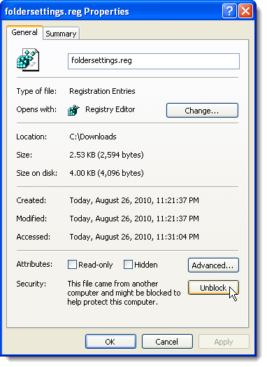 The Properties dialog box for the foldersettings.reg file displays. Make sure the General tab is active. Click the Unblock button.
