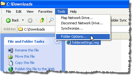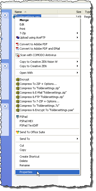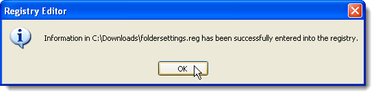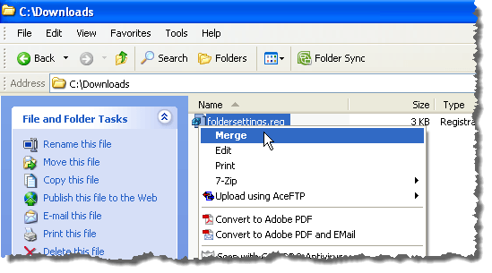 In Windows Explorer, navigate to where you saved the foldersettings.reg file, right-click on the file and select Merge from the popup menu. The fix in this registry entry file can be applied in Windows XP as well as in Windows 7/Vista.